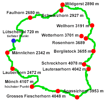 Die «Länge» des Gemeindeterritoriums beträgt vom nördlichsten Punkt (Wildgärst) zum südlichsten Punkt (Agassizhorn) 16.5 km Luftlinie; vom westlichsten Punkt (Männlichen) zum östlichsten Punkt (nördl. Bärglistock) 15.8 km. Die Ausdehnung NW – SO (westl. Faulhorn – Finsteraarjoch) ist mit 17.6 km am längsten. Das Gebiet zieht sich von 720 m bis 4107 m hinauf. Das Dorf selber liegt auf 1050 m Höhe.